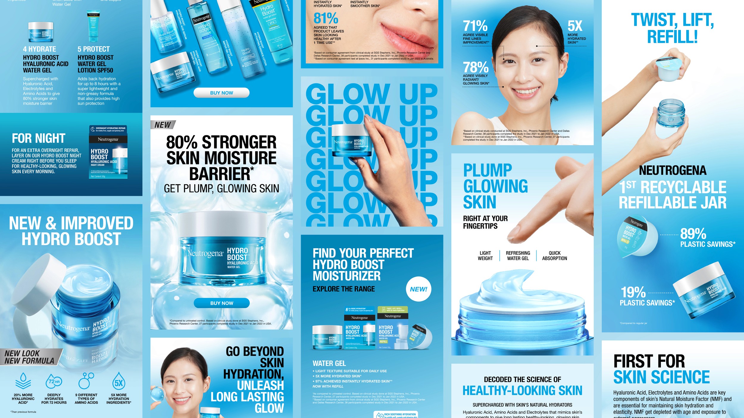 Neutrogena Hydro Boost arrived with a new formula and its first recyclable, reusable jar, a product innovation that deserved more than a standard product page. The refreshed e-commerce detail pages combined macro imagery, tactile visuals, and animations to translate skincare science into a dynamic, purchase-driving customer journey across APAC markets.